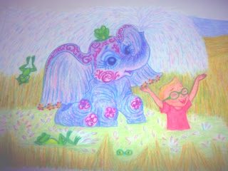 A little more progress made on the illustration job. Here are pages 5-6. Photos really don't do it justice. (Sigh) I really like how the baby elephant turned out, with her lovely mulberry tattoos and golden earrings. The giraffe is a different take on the hottest item in my Etsy shop, a Purple Giraffe (seen below). I didn't want it to be exactly the same, so I went with a side view and a pinker color scheme. As it's a 2 page spread which the author wants presented as one scene, it's sometimes difficult for me to figure out how to illustrate both of the ideas seamlessly. It has to make sense as a whole scene, yet each also needs to stand out on its own. They also need to be large enough for the individual details to be seen. It's an interesting challenge on the perspective. This time I went with showing just part of the giraffe in the foreground of the 2nd page, so I could still do a full figured elephant.